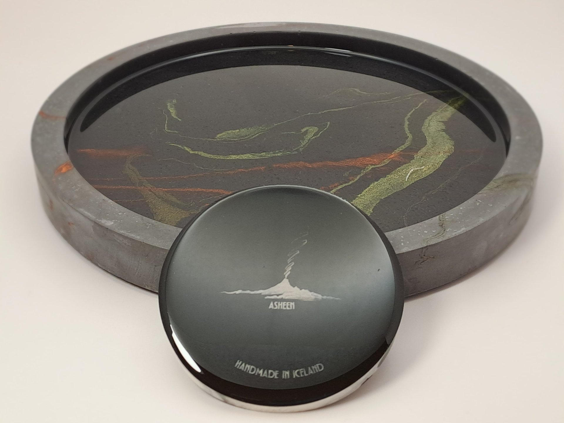 Each piece blends gypsum and resin, echoing Iceland's wild beauty