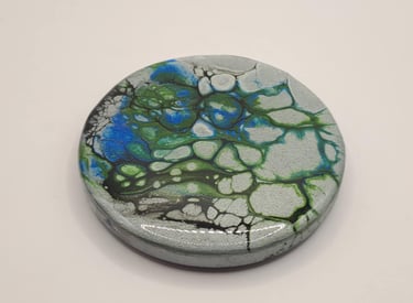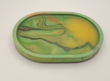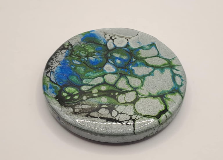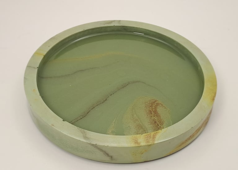 A tribute to the Eldhraun lava fields, where greenery slowly reclaims the stone. The ashy texture of colored gypsum represents ancient lava, brought to life by a sheen of resin that mimics the dew-covered moss of a summer morning.