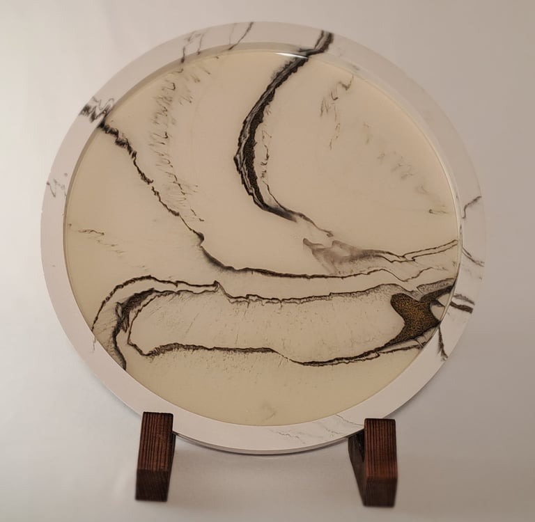 In contrast, the resin acts as a translucent awakening of light. As a high-grade liquid polymer, it cures into a durable, high-gloss solid resistant to shattering and abrasion. This transparency allows light to illuminate the gypsum base, mirroring the refractive clarity of glacial ice or the shifting glow of the aurora. By uniting these elements, Asheen bridges the earthy permanence of stone with the luminous clarity of light —resulting in work that is ancient in spirit and refined in form.