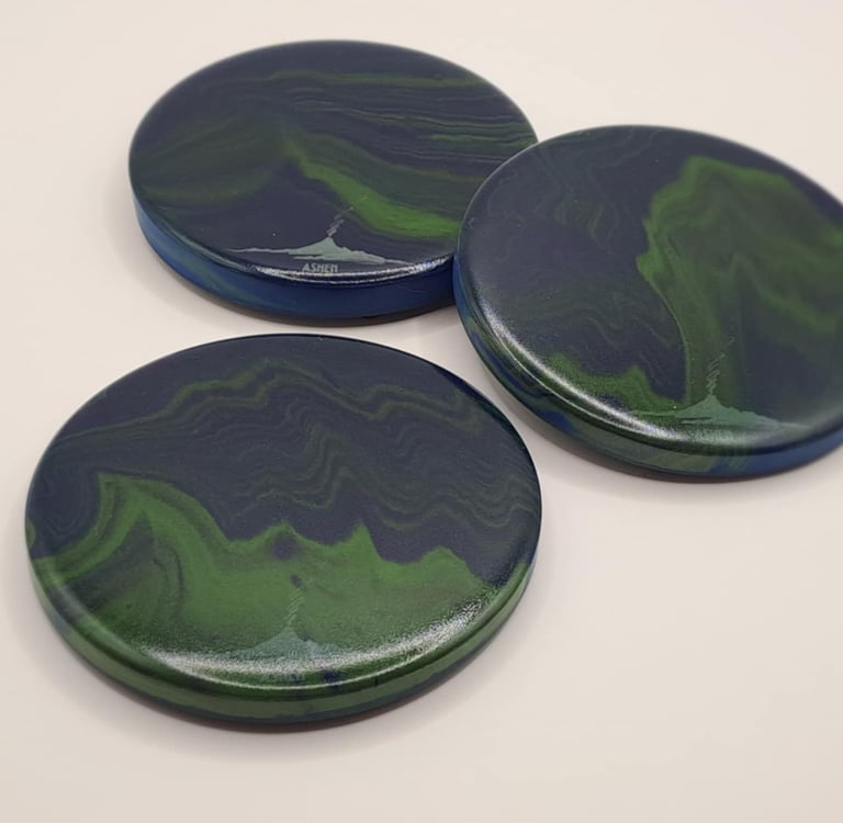 In contrast, the resin component acts as a translucent awakening of light. As a liquid polymer, it cures into a highly durable, glossy solid resistant to shattering, abrasion, and moisture. This transparency allows light to illuminate the gypsum base, mirroring the crystalline clarity of glacial ice or the shifting glow of the aurora. By uniting these elements, Asheen bridges the earthy permanence of stone with the sheen of resin, resulting in work that is both ancient in spirit and vital in form.